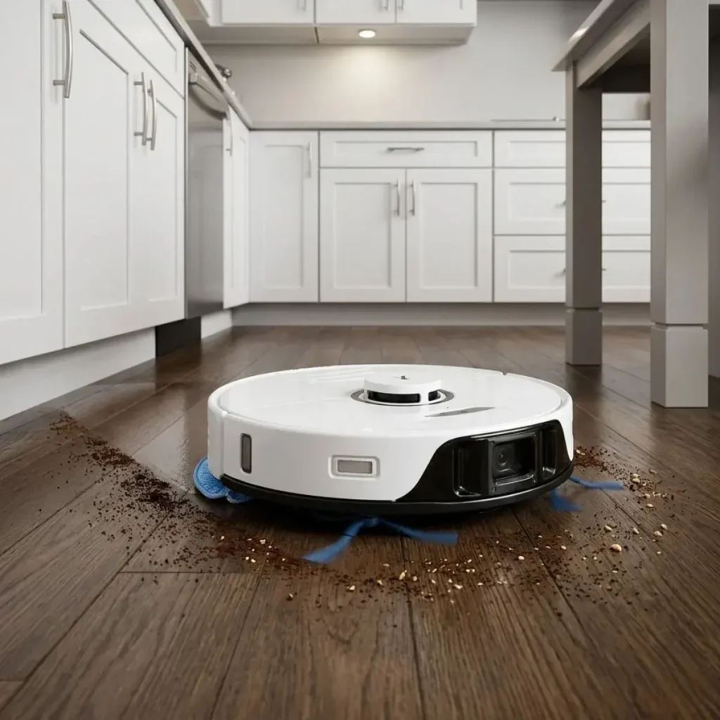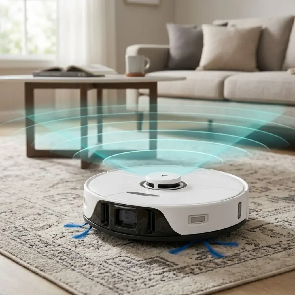 Sistemul LiDAR scanează camerele și stabilește traseul optim. Evită obstacolele și curăță inclusiv zonele greu accesibile.