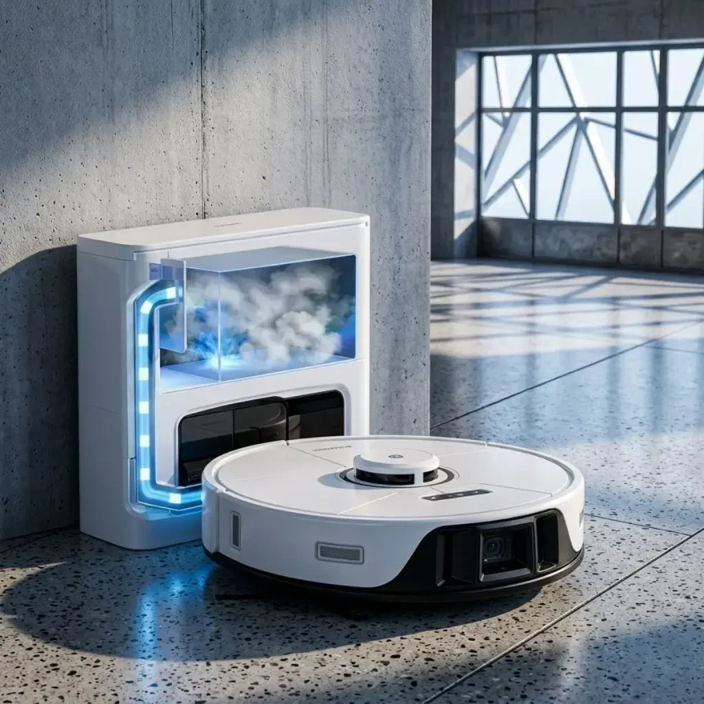 După fiecare utilizare, robotul descarcă murdăria în stația dedicată. Poate funcționa până la 60 de zile fără golire manuală.